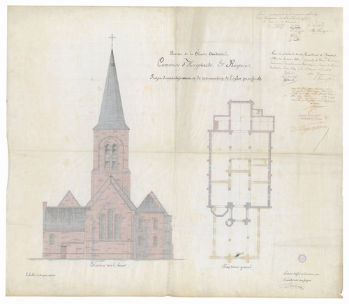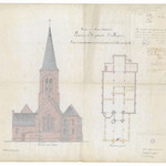 Opschrift: Province de la Flandre Occidentale. Commune d'Hoogstaede - St.Ricquier. Projet d'agrandissement et de restauration de l'eglise paroissiale. Omschrijving plan: opstand achtergevel en plattegrond Datum KCML: deze informatie wordt niet vermeld op het archiefstuk Archiefnummer: W0003