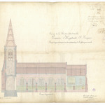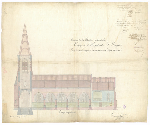 Opschrift: Province de la Flandre Occidentale. Commune d'Hoogstaede - St.Ricquier. Projet d'agrandissement et de restauration de l'eglise paroissiale. Omschrijving plan: langsdoorsnede Datum KCML: deze informatie wordt niet vermeld op het archiefstuk Archiefnummer: W0005