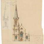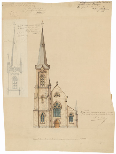 Opschrift: Ontwerp eener nieuwe kerk te kerkhove provintie westvlaenderen arrondissement Kortrijk Omschrijving plan: opstand voorgevel Datum KCML: 19/01/1864 Archiefnummer: W0068