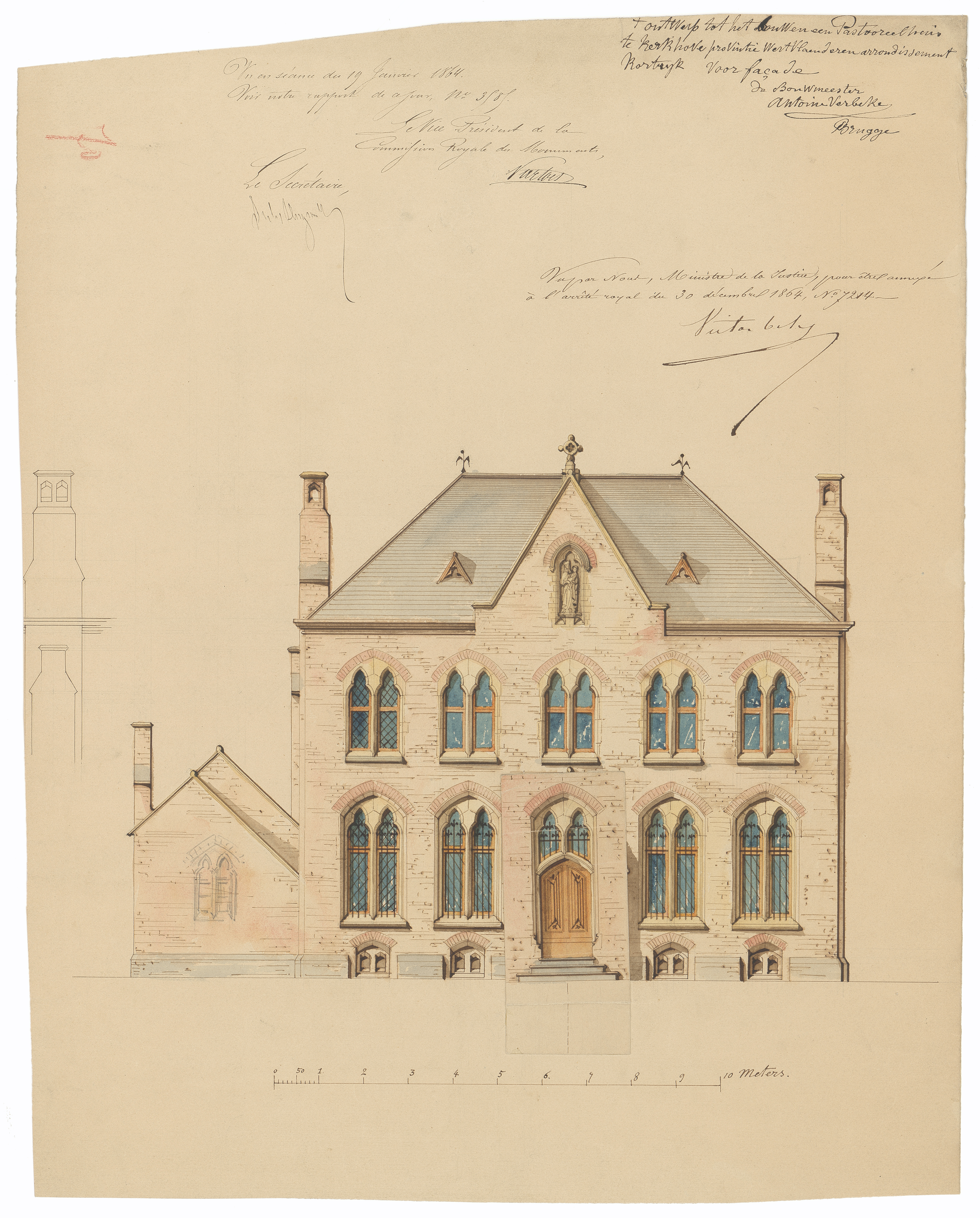 Opschrift: Ontwerp tot het bouwen een Pastoreelhuys te Kerkhove proventie westvlaenderen arrondissement Kortrijk Omschrijving plan: opstand voorgevel (aangepast ontwerp) Datum KCML: 19/01/1864 Archiefnummer: W0083_01