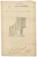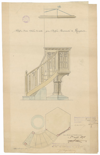 Opschrift: Projet d'une chaire de verité pour l'Eglise paroissiale de Hoogstaede Omschrijving plan: ontwerp biechtstoel Datum KCML: 29/04/1899 Archiefnummer: W0009