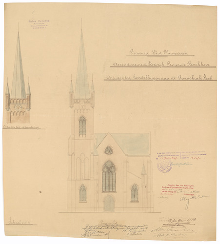 Opschrift: Provincie West Vlaanderen. Arrondissement Kortrijk. Gemeente Kerckhove. Ontwerp tot herstellingen aan de Parochiale Kerk. Omschrijving plan: opstand voorgevel Datum KCML: 20/02/1909 Archiefnummer: W0077