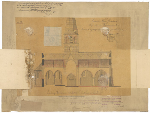 Drager: kalk op papier, randen verstevigd met doek Techniek: pen, opgehoogd met aquarel, aanpassingen op kalk en op kalk op papier opgekleefd Afmetingen (h x b in mm): 440 x 578 mm Schaal: 1/100