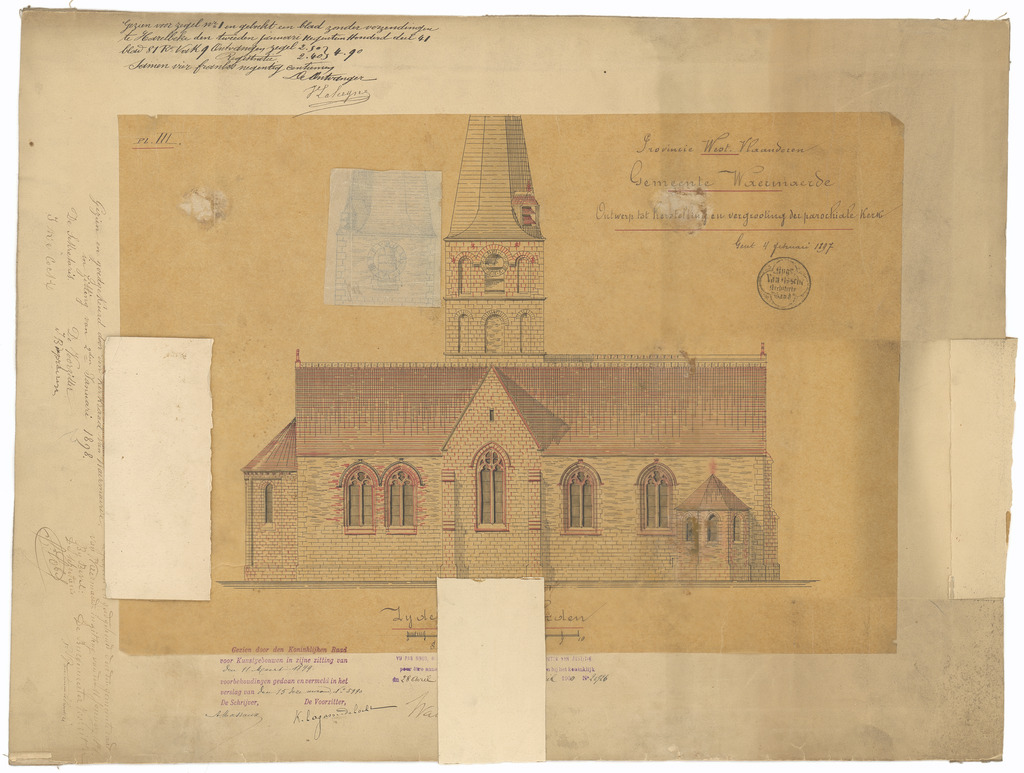 Opschrift: Provincie West-Vlaanderen. Gemeente Waermaerde, Ontwerp tot herstelling en vergrooting der parochiale kerk. Omschrijving plan: opstand N-gevel Datum KCML: 11/03/1899 Archiefnummer: W0091_03