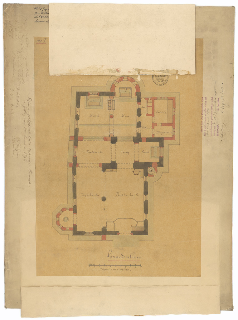 Drager: kalk op papier, randen verstevigd met doek Techniek: pen, opgehoogd met aquarel, aanpassingen op kalk op papier opgekleefd Afmetingen (h x b in mm): 579 x 446 mm Schaal: 1/100