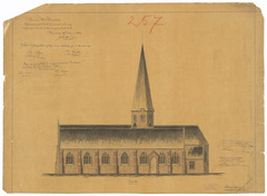 Opschrift: West-Vlaanderen. Arrondissement Thielt - Gemeente Coolscamp. Ontwerp tot het herstellen der Parochiale Kerk. Omschrijving plan: opstand zijgevel 1 Datum KCML: 24/06/1893 Archiefnummer: W0044