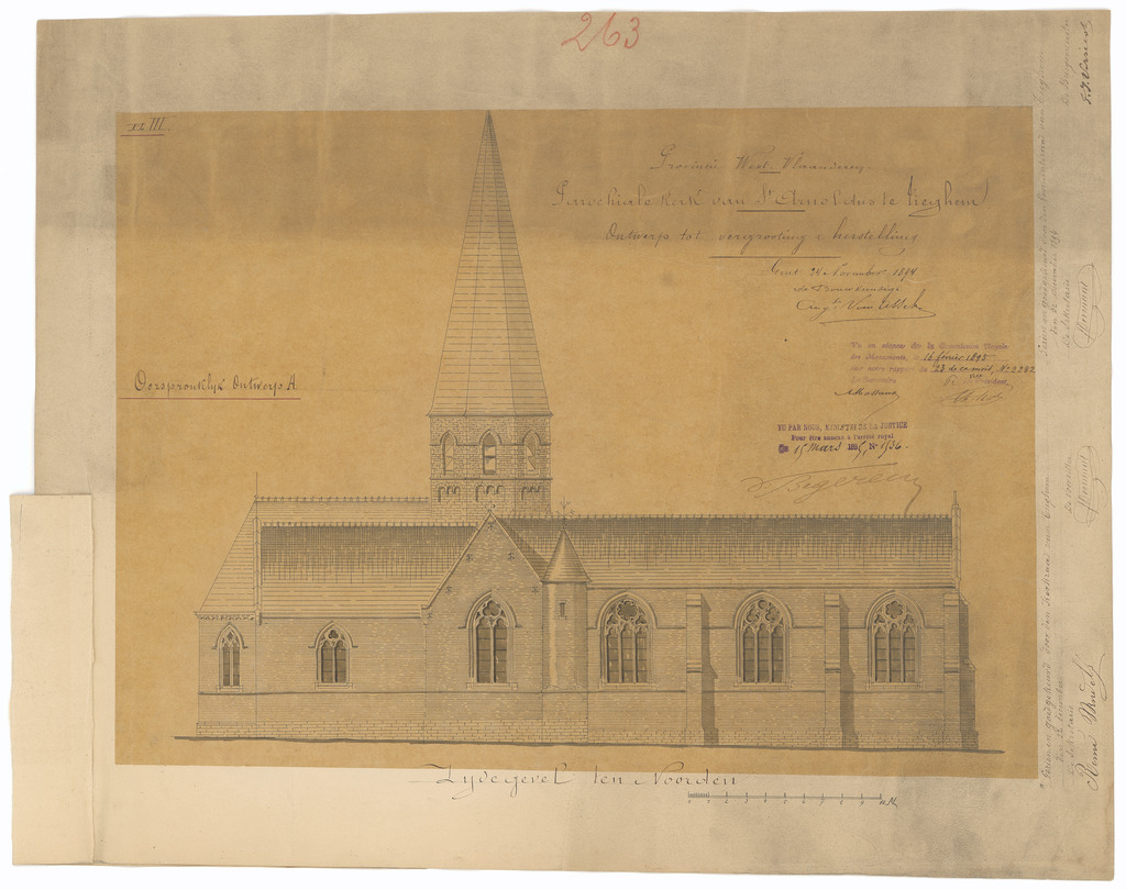 Opschrift: Provincie West-Vlaanderen. Parochiale Kerk van St.Arnoldus te Tieghem. Ontwerp tot vergrooting & herstelling. Omschrijving plan: opstand N-gevel Datum KCML: 16/02/1895 Archiefnummer: W0027_02