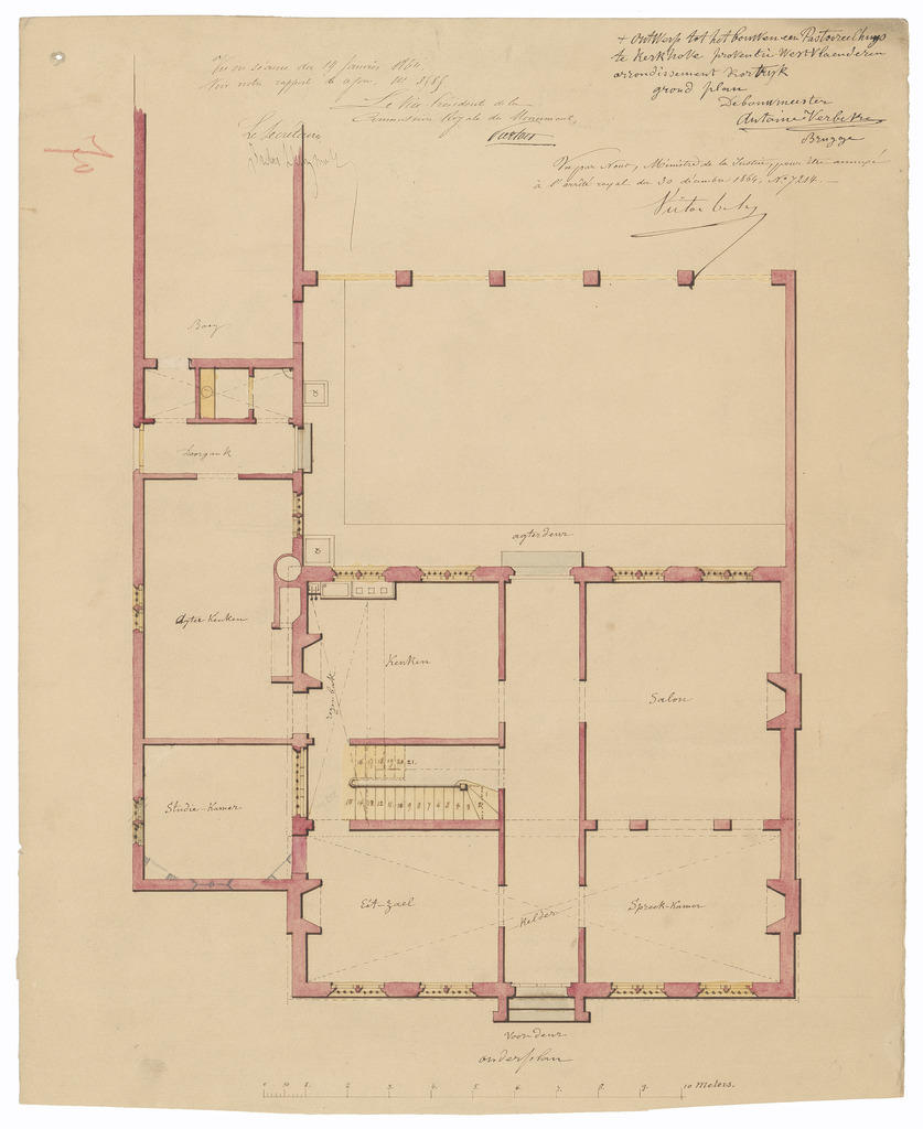 Opschrift: Ontwerp tot het bouwen een Pastoreelhuys te Kerkhove proventie westvlaenderen arrondissement Kortrijk Omschrijving plan: plattegrond niveau 0 Datum KCML: 19/01/1864 Archiefnummer: W0081