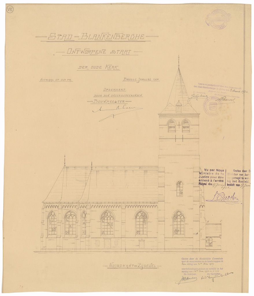 Opschrift: Stad Blankenberghe. Ontworpene staat der oude Kerk. Omschrijving plan: opstand zijgevel 1 Datum KCML: 24/05/1924 Archiefnummer: W0131