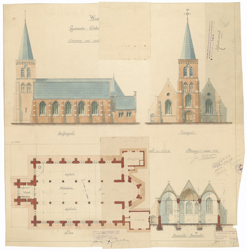 Opschrift: West-Vlaanderen. Gemeente Oedelem. Parochie Oostveld. Ontwerp van eene nieuwe Kerk. Omschrijving plan: plattegrond, opstanden voor- en zijgevel, dwarsdoorsnede (aangepast ontwerp) Datum KCML: 11/05/1912 Archiefnummer: W0111_02
