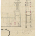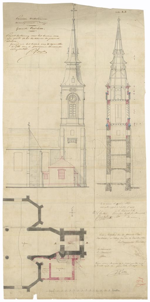 Opschrift: Provincie Westvlaenderen. Arrondissement Brugge. Gemeente Oedelem. Project teekening voor het bouwen van eene naeld op den kerktooren der gemeente Oedelem. Omschrijving plan: plattegrond, aanzicht en doorsnede kerktoren Datum KCML: 29/06/1867 Archiefnummer: W0103