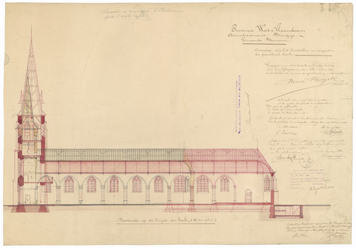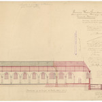Opschrift: Provincie West-Vlaanderen. Arrondissement Brugge. Gemeente Beernem. Ontwerp voor het herstellen en vergrooten van de parochiale Kerk. Omschrijving plan: langsdoorsnede Datum KCML: 5-5-1900 Archiefnummer: W0102