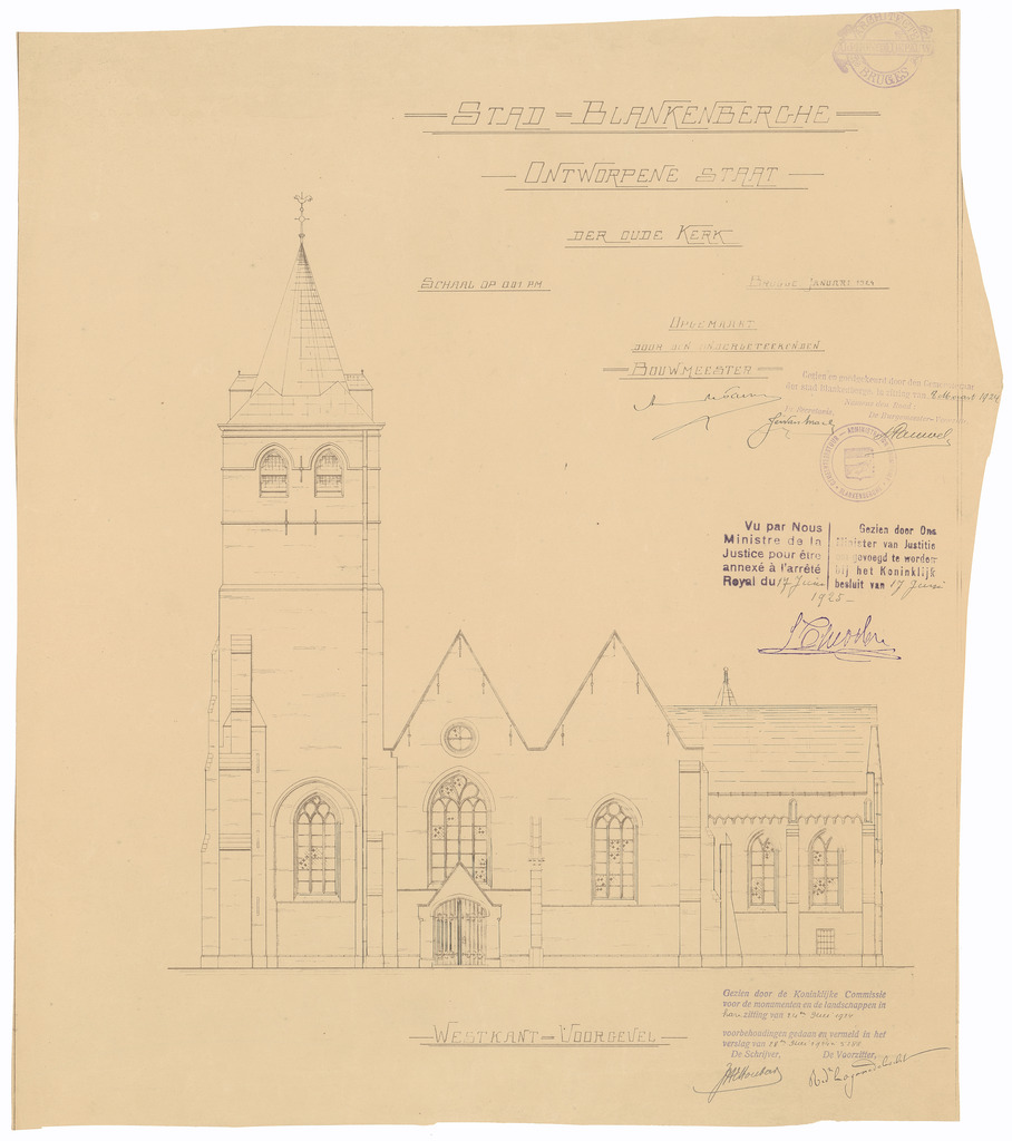 Opschrift: Stad Blankenberghe. Ontworpene staat der oude Kerk. Omschrijving plan: opstand voorgevel Datum KCML: 24/05/1924 Archiefnummer: W0130