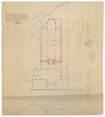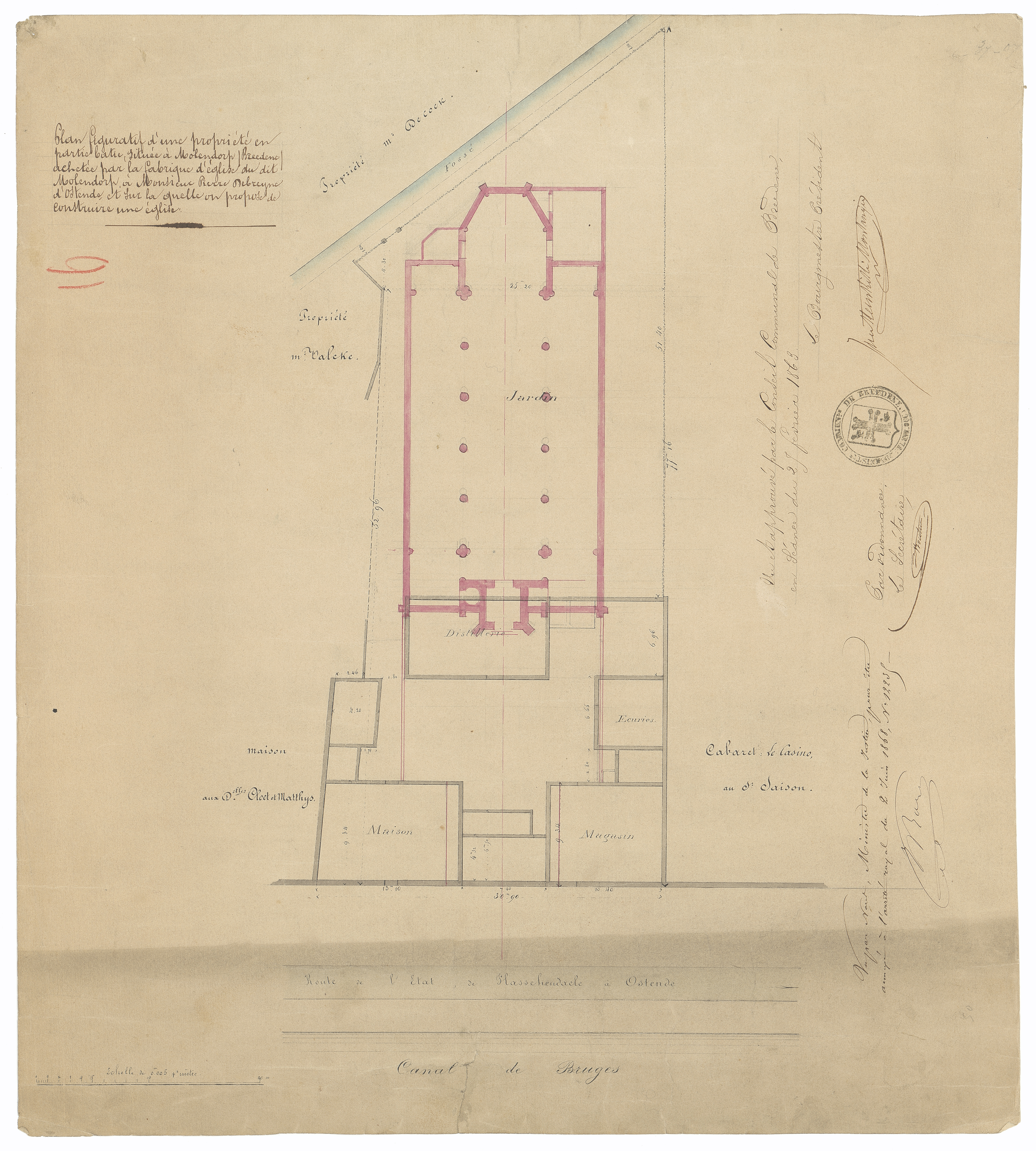 Opschrift: Plan figuratif d'une propriété en partie batie, située à Molendorp (Breedene) achetée par la fabrique d'église du dit Molendorp à Monsieur Pierre Debreyne d'Ostende et sur la quelle on propose de construire une église, Omschrijving plan: situatieplan Datum KCML: deze informatie wordt niet vermeld op het archiefstuk Archiefnummer: W0158