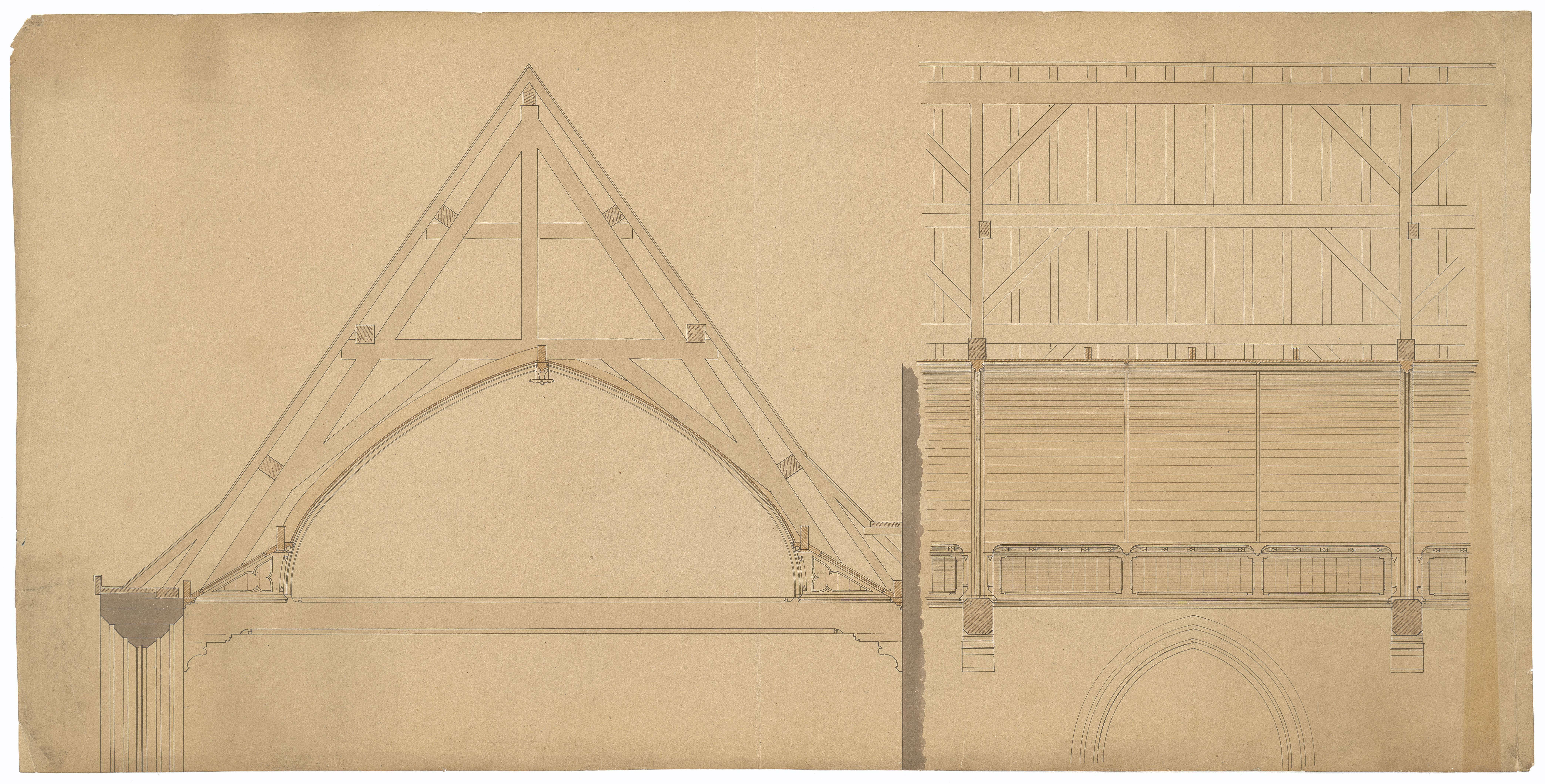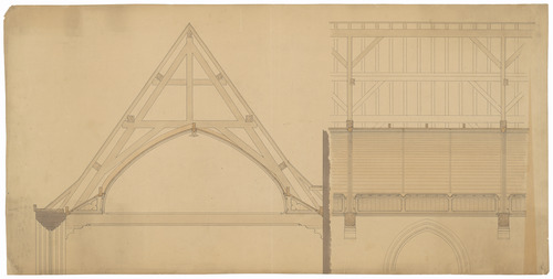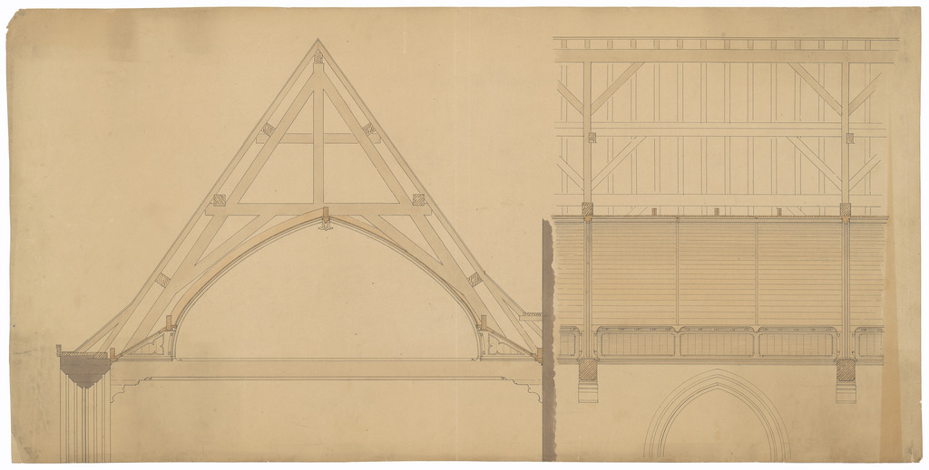 Opschrift: deze informatie wordt niet vermeld op het archiefstuk Omschrijving plan: ontwerp dakgebinte en zoldering Datum KCML: deze informatie wordt niet vermeld op het archiefstuk Archiefnummer: W0151
