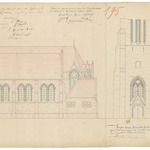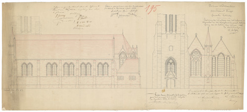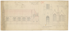 Opschrift: Procincie Westvlaanderen. Arrondissement Brugge. Gemeente Uitkerke. Teekening van het ontwerp voor het herbouwen en vergrooten van het Kerkgebouw der gemeente Uitkerke. Omschrijving plan: opstanden voor- en zijgevel Datum KCML: 22/12/1888 Archiefnummer: W0136 Ontwerper: mogelijks De Rym, voornaam onbekend