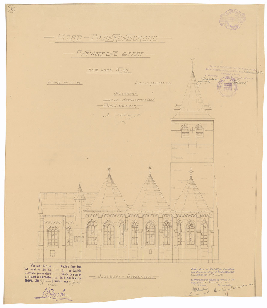 Opschrift: Stad Blankenberghe. Ontworpene staat der oude Kerk. Omschrijving plan: opstand O-gevel Datum KCML: 24/05/1924 Archiefnummer: W0132