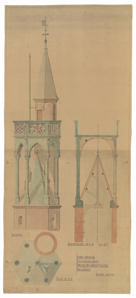Opschrift: Stad Brugge. Technische Dienst. Museum Gruuthuuse. Belvedeer Omschrijving plan: detailtekeningen torenspits Datum KCML: deze informatie wordt niet vermeld op het archiefstuk Archiefnummer: W0168