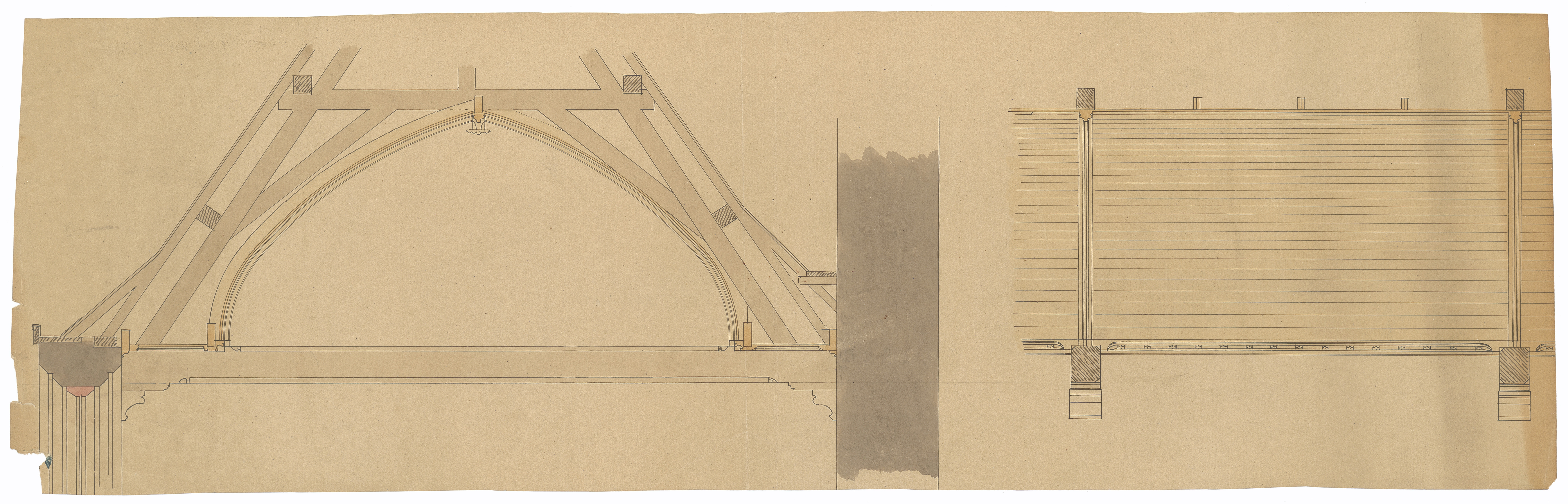 Opschrift: deze informatie wordt niet vermeld op het archiefstuk Omschrijving plan: ontwerp dakgebinte en zoldering Datum KCML: deze informatie wordt niet vermeld op het archiefstuk Archiefnummer: W0152
