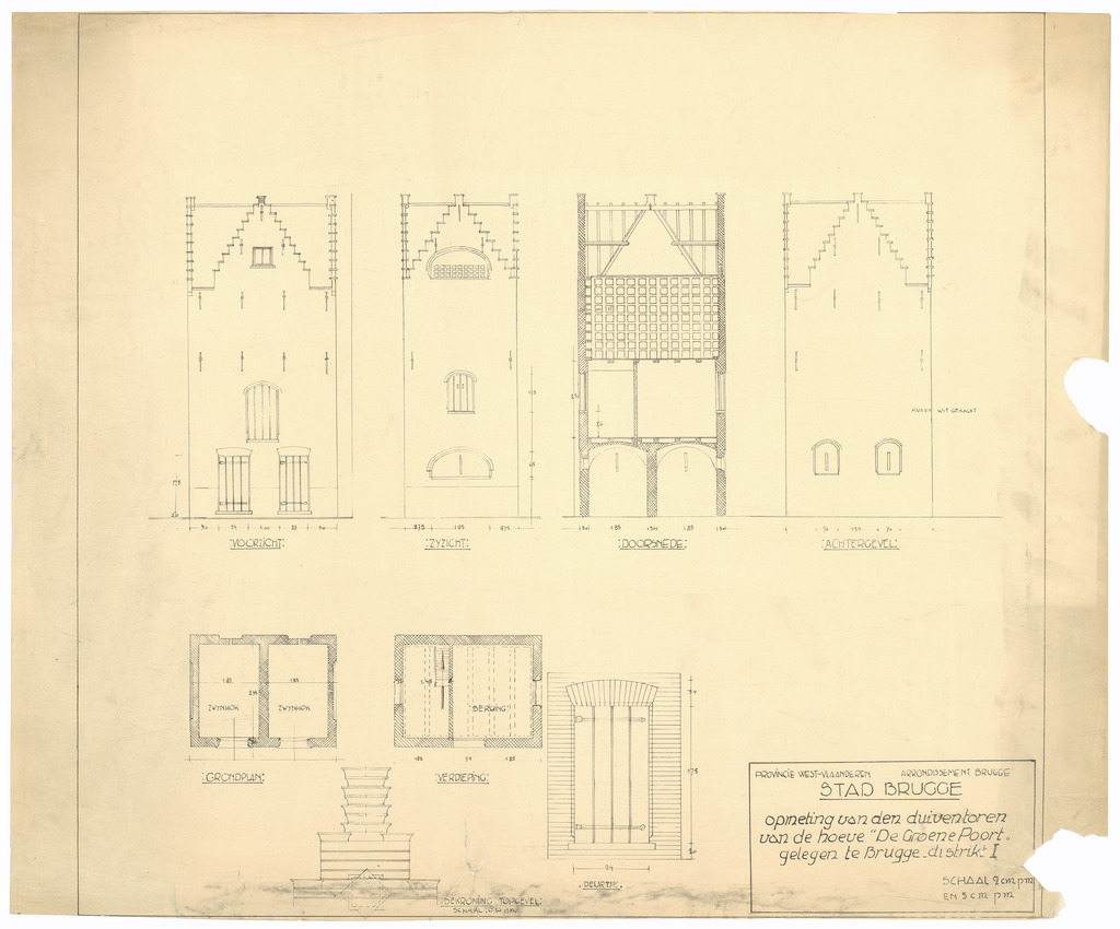 Opschrift: Provincie West-Vlaanderen. Arrondissement Bruge. Stad Brugge. Opmeting van den duiventoren van de hove "De Groene Poort" gelegen te Brugge - distrikt I Omschrijving plan: Opmeting duiventoren Datum KCML: deze informatie wordt niet vermeld op het archiefstuk Archiefnummer: W0163