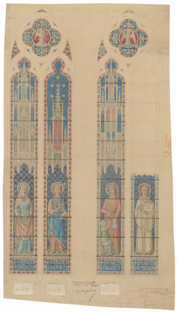 Opschrift: Vitraux du choeur. Eglise St.Sauveur à Bruges. Omschrijving plan: ontwerp glasraam Datum KCML: 06/01/1894 Archiefnummer: W0227