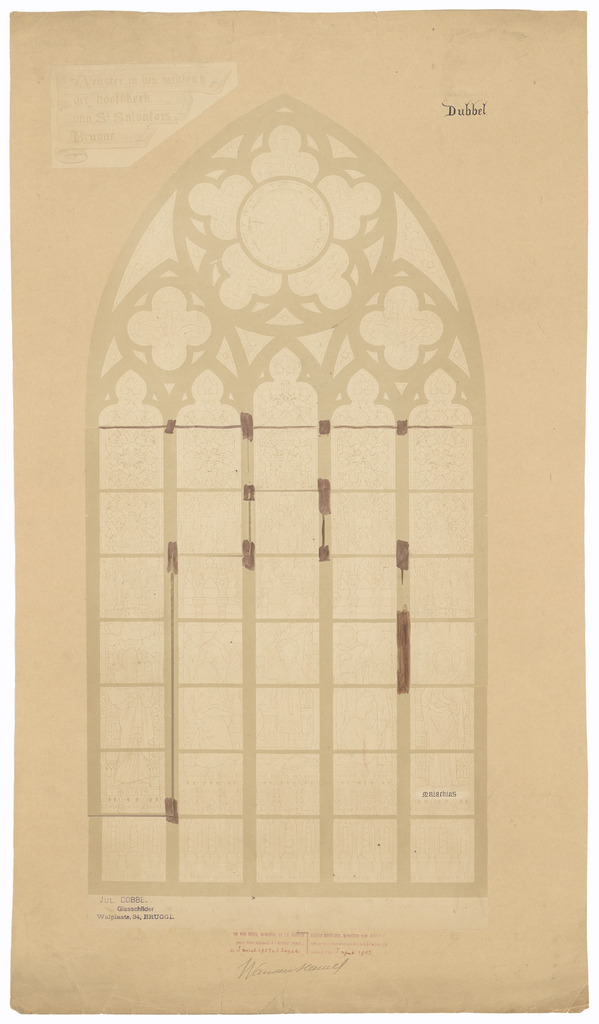 Opschrift: Venster ut den midbeuk der hoofdkerk van St.Salvators Brugge Omschrijving plan: ontwerp glasraam Datum KCML: deze informatie wordt niet vermeld op het archiefstuk Archiefnummer: W0243