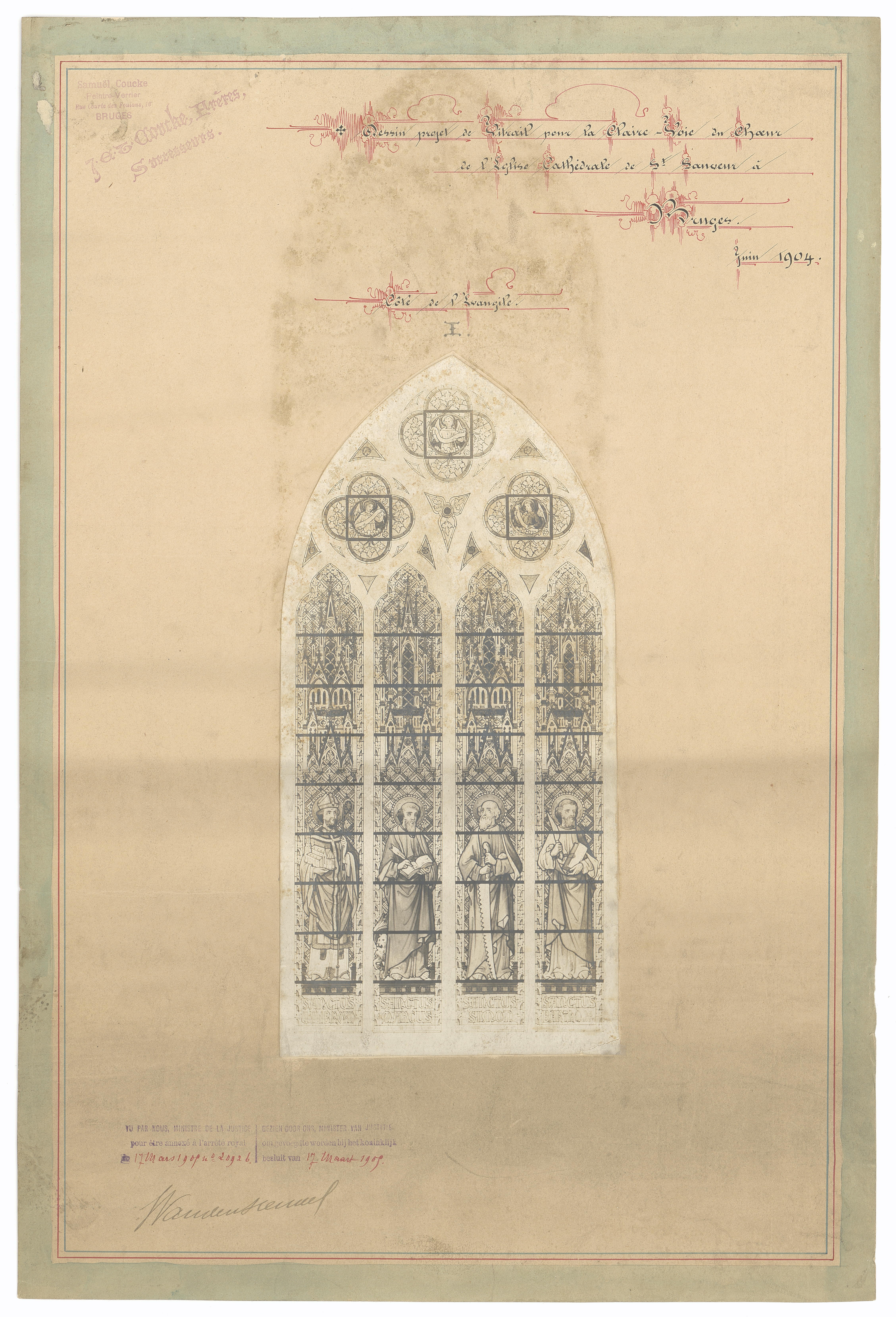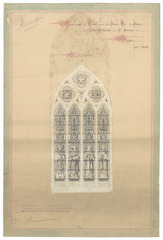 Opschrift: Dessin projet de Vitrail pour la claire voie du choeur de l'Eglise cathédrale de St. Sauveur à Bruges. Omschrijving plan: ontwerp glasraam Datum KCML: deze informatie wordt niet vermeld op het archiefstuk Archiefnummer: W0238