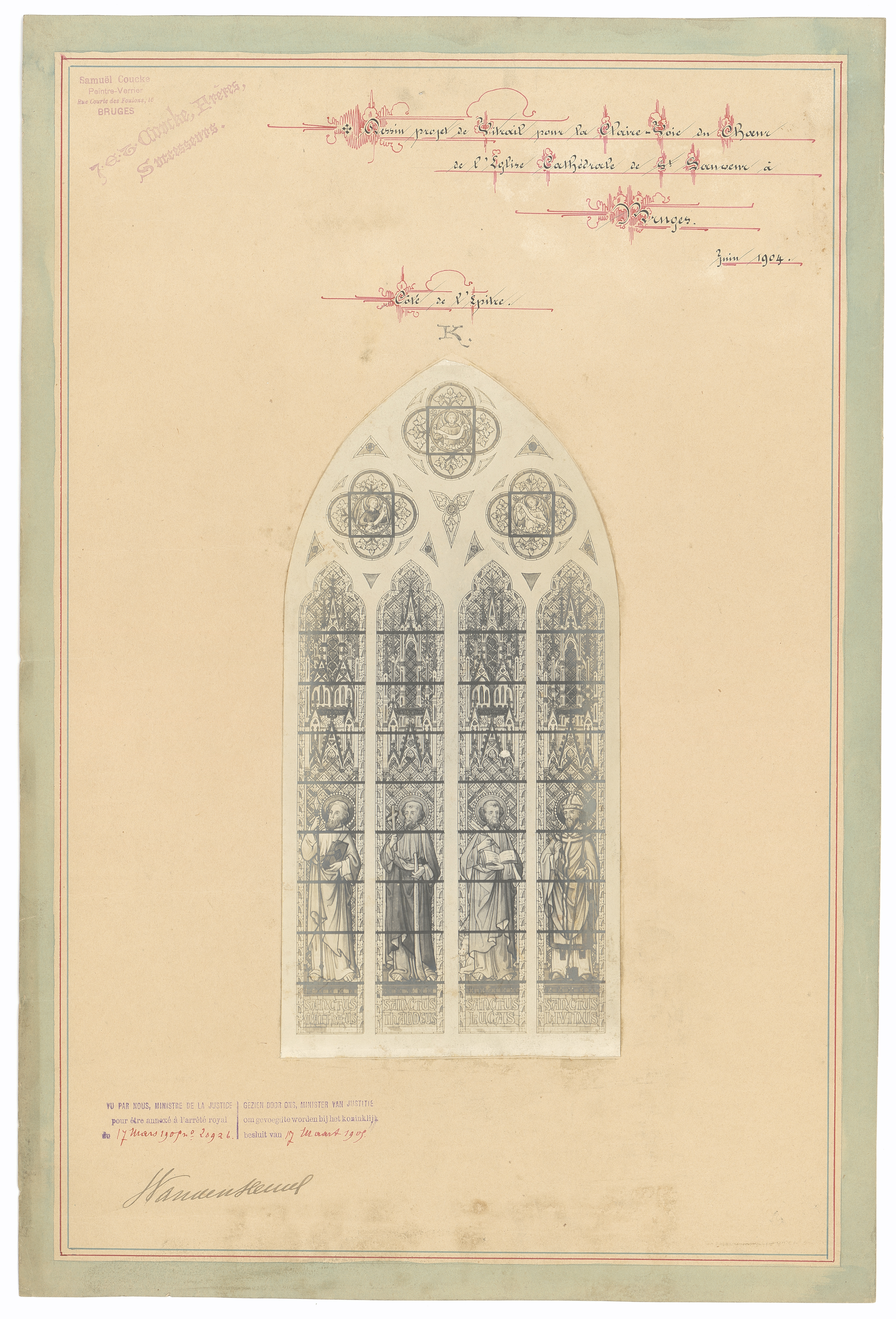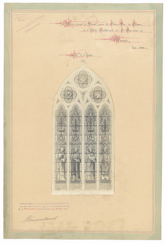 Opschrift: Dessin projet de Vitrail pour la claire voie du choeur de l'Eglise cathédrale de St. Sauveur à Bruges. Omschrijving plan: ontwerp glasraam Datum KCML: deze informatie wordt niet vermeld op het archiefstuk Archiefnummer: W0237