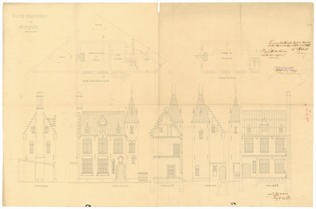 Opschrift: Eglise paroissiale de St. Jacques. Omschrijving plan: opstanden gevels, plattegronden Datum KCML: 06/06/1891 Archiefnummer: W0220