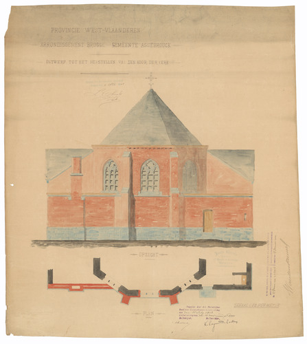 Opschrift: Provincie West-Vlaanderen. Arrondissement Brugge - Gemeente Assebrouck. Ontwerp tot het herstellen van de den koor ker kerk. Omschrijving plan: opstand achtergevel Datum KCML: 11/07/1903 Archiefnummer: W0271