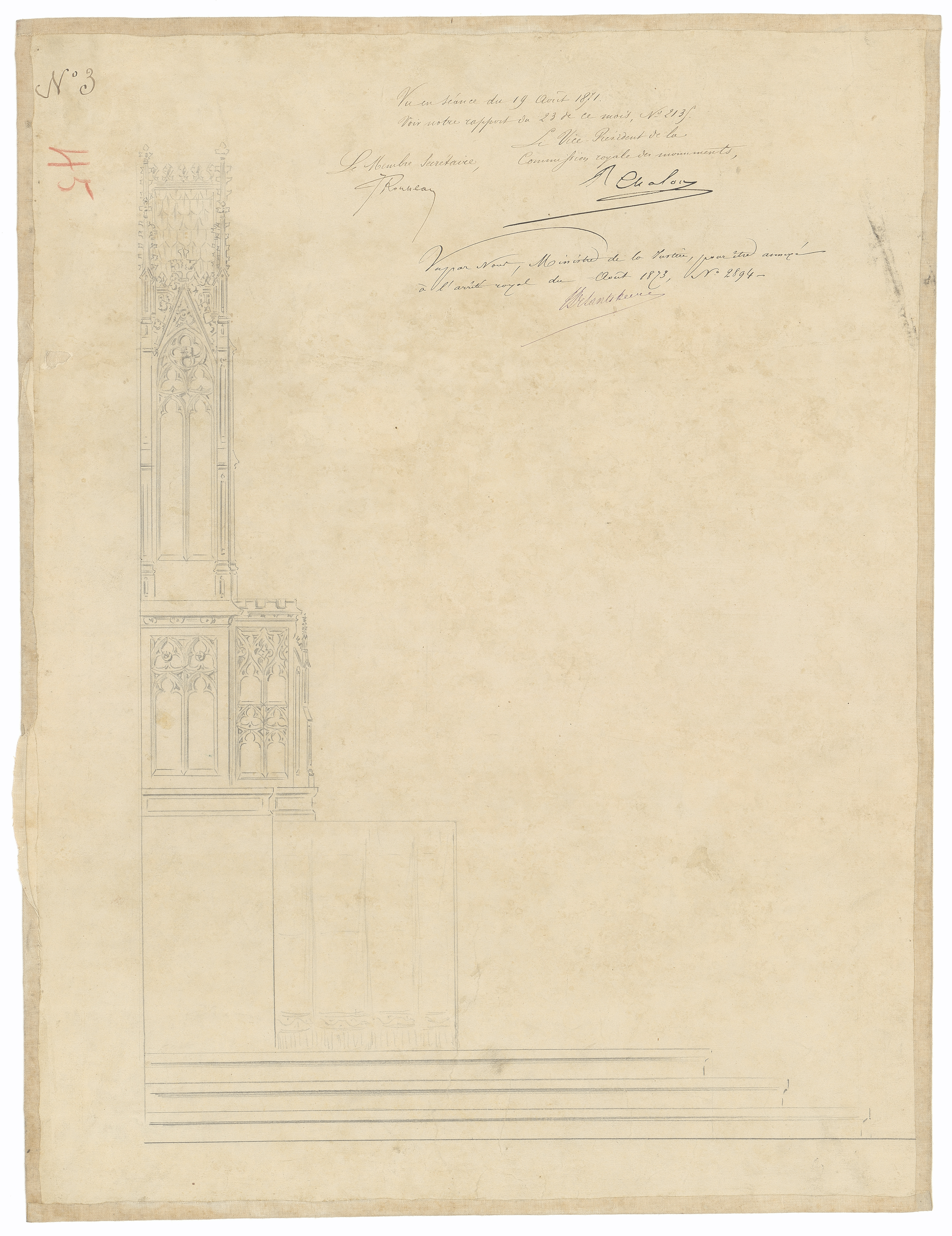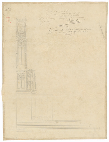 Opschrift: deze informatie wordt niet vermeld op het archiefstuk Omschrijving plan: ontwerp altaar, zijaanzicht Datum KCML: 19/08/1871 Archiefnummer: W0260