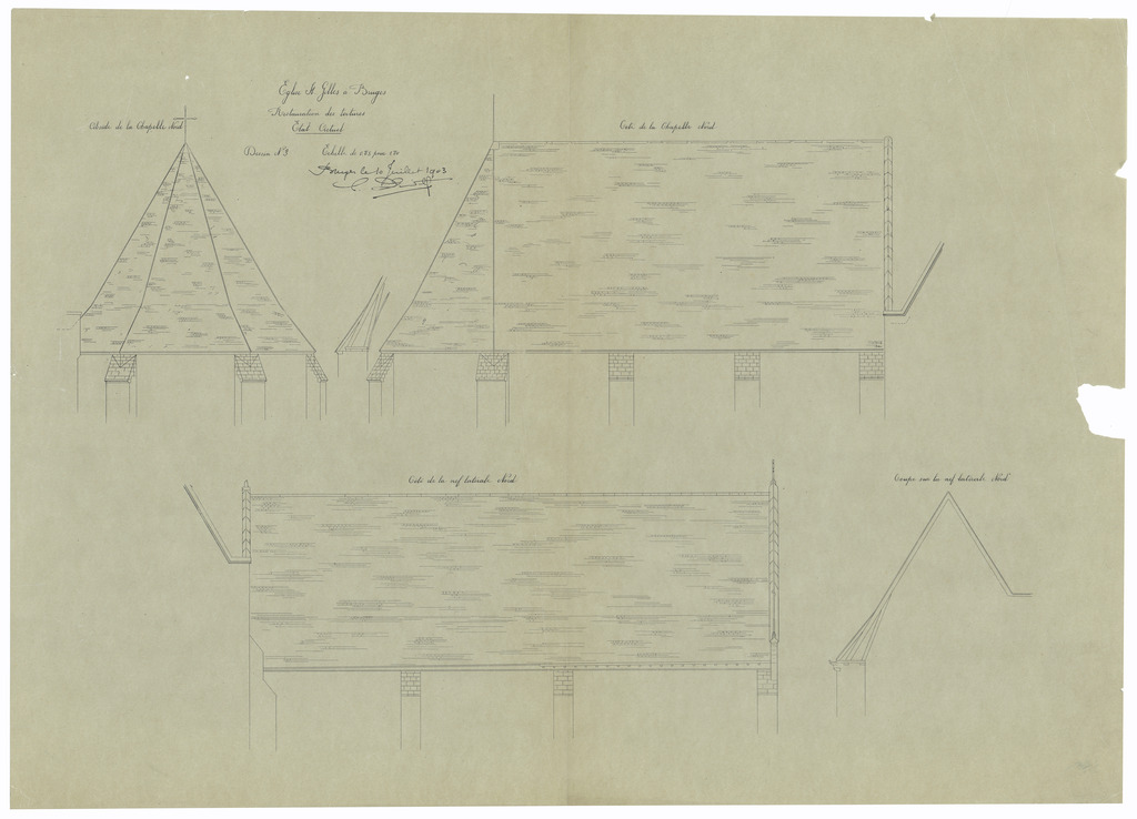Opschrift: Eglise St. Gilles à Bruges. Restauration des toitures. Etat actuel Omschrijving plan: detailtekeningen bedaking Datum KCML: deze informatie wordt niet vermeld op het archiefstuk Archiefnummer: W0215