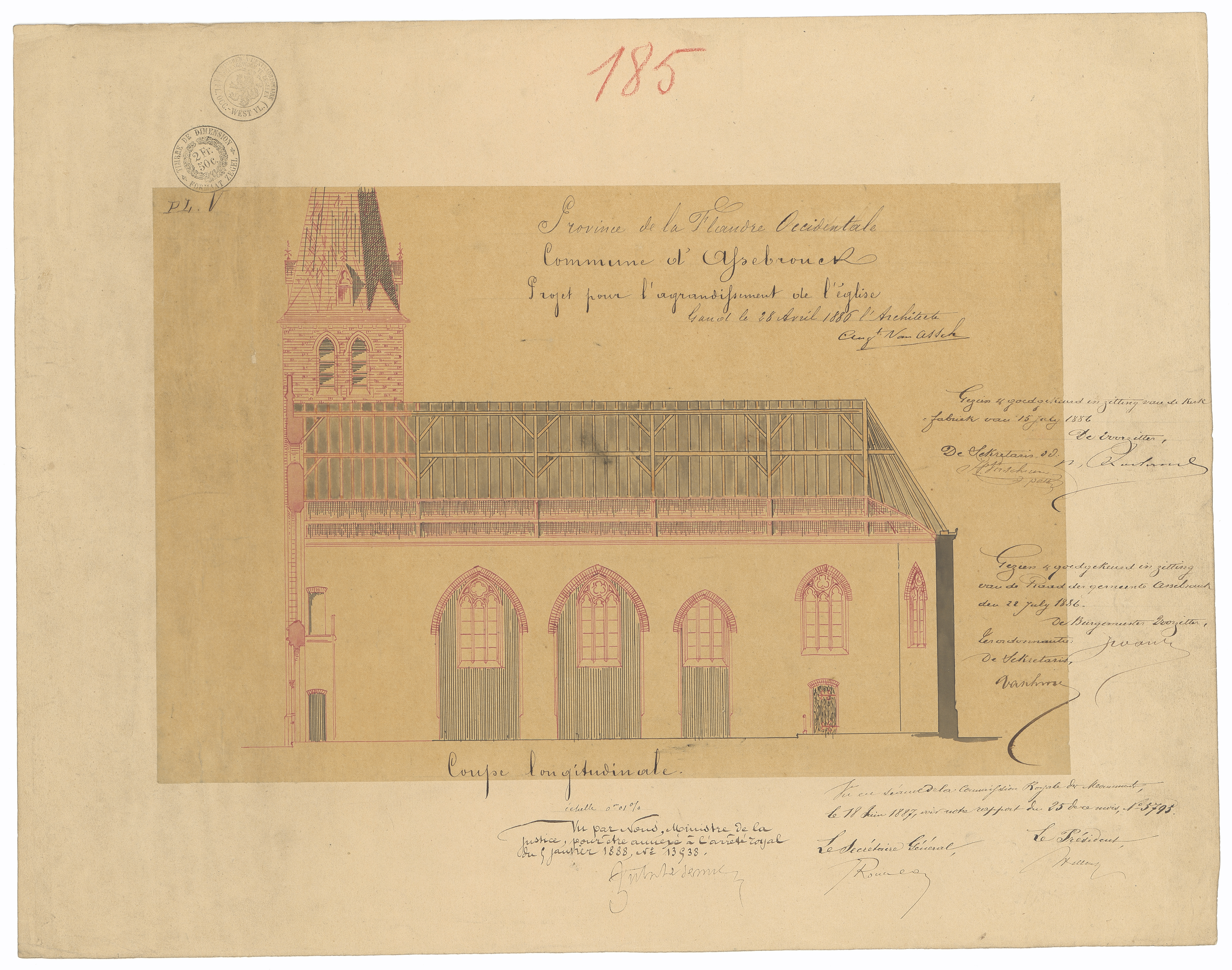 Opschrift: Province de la Flandre Occidentale. Commune d'Assebrouck. Projet pour l'agrandissement de l'Eglise. Omschrijving plan: langsdoorsnede Datum KCML: 18/06/1887 Archiefnummer: W0268