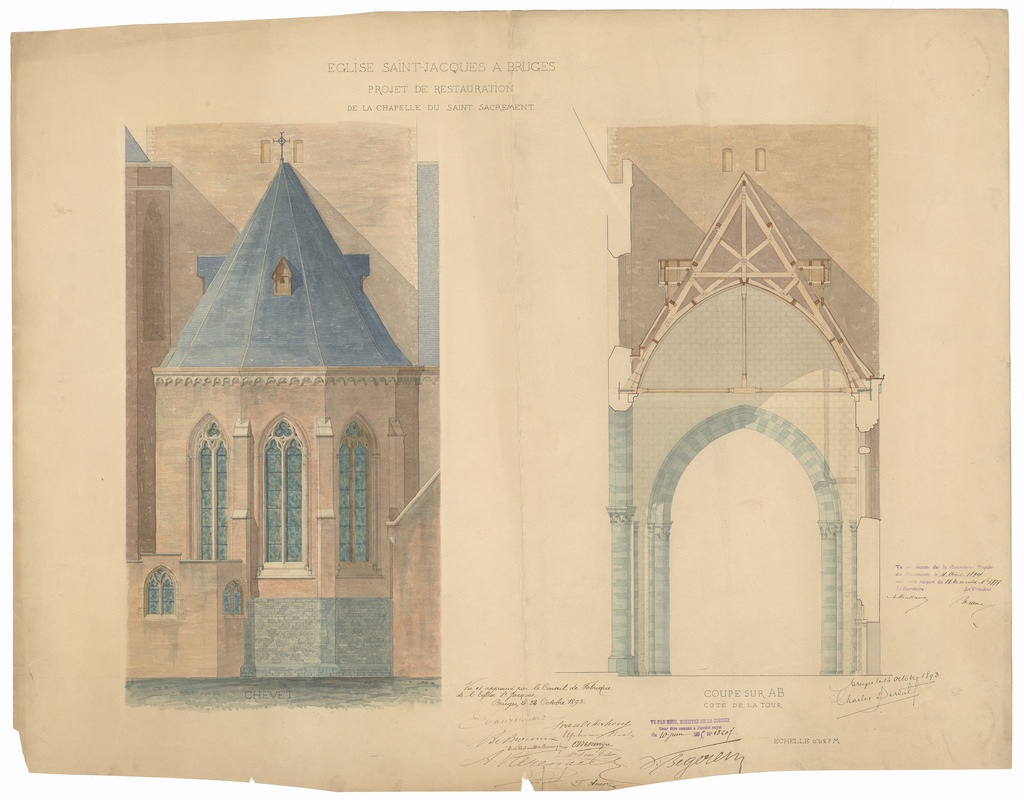 Opschrift: Eglise Saint-Jacques à Bruges. Projet de restauration de la chapelle du Saint-Sacrement. Omschrijving plan: opstand gevel en doorsnede Datum KCML: 04/08/1894 Archiefnummer: W0222