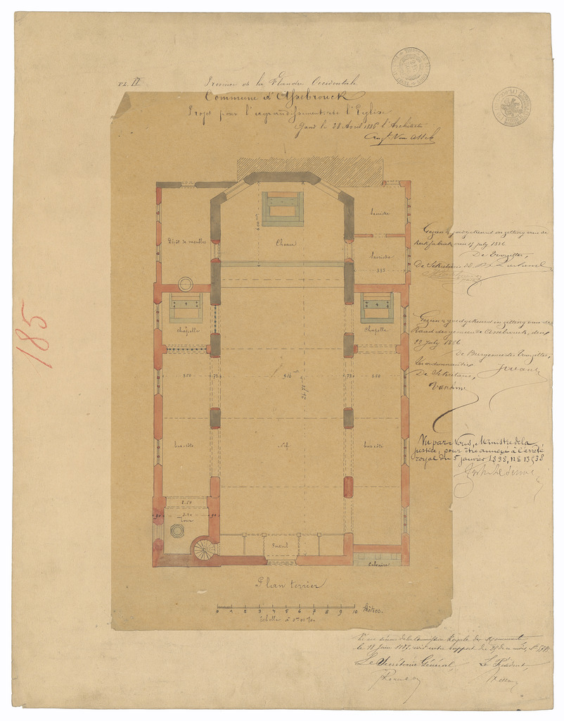 Opschrift: Province de la Flandre Occidentale. Commune d'Assebrouck. Projet pour l'agrandissement de l'Eglise. Omschrijving plan: plattegrond niveau 0 Datum KCML: 18/06/1887 Archiefnummer: W0265
