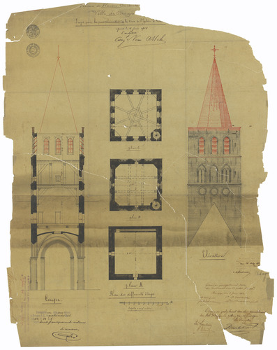 Opschrift: Province de Flandre Occidentale. Ville de Bruges. Projet pour la restauration de la tour de l'église St.Gil[les] Omschrijving plan: plannen toren Datum KCML: 16/07/1904 Archiefnummer: W0219