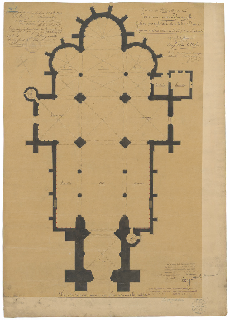 Opschrift: Province de la Flandre Occidentale. Commune de Lisseweghe. Eglise paroissiale de Notre Dame. Projet de restauration de la Nef et des Bas-côtés. Omschrijving plan: plattegrond niveau 0 Datum KCML: 3-7-1909 Archiefnummer: W0297