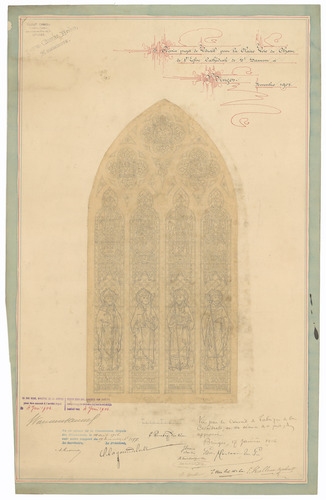Opschrift: Dessin projet de Vitrail pour la claire voie du choeur de l'Eglise cathédrale de St. Sauveur à Bruges. Omschrijving plan: ontwerp glasraam Datum KCML: 14/04/1906 Archiefnummer: W0239