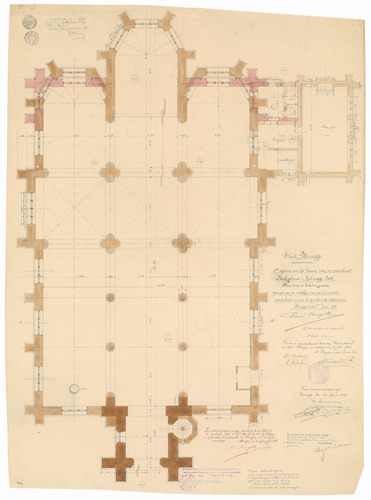 Opschrift: Stad Brugge. 3e ontwerp voor het opbouwen van een parochiaal kerkgebouw te Zeebrugge-Oost. Omschrijving plan: plattegrond niveau 0 Datum KCML: 3-10-1908 Archiefnummer: W0314