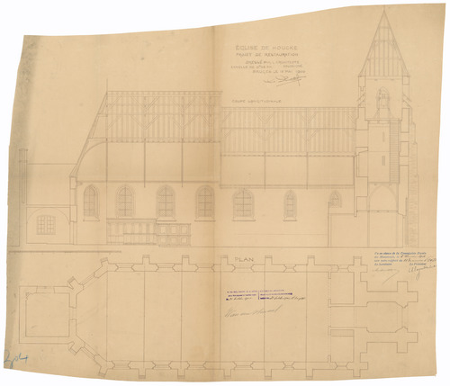 Opschrift: Eglise de Houcke. Projet de restauration Omschrijving plan: plattegrond en langsdoorsnede Datum KCML: 5-1-1901 Archiefnummer: W0343