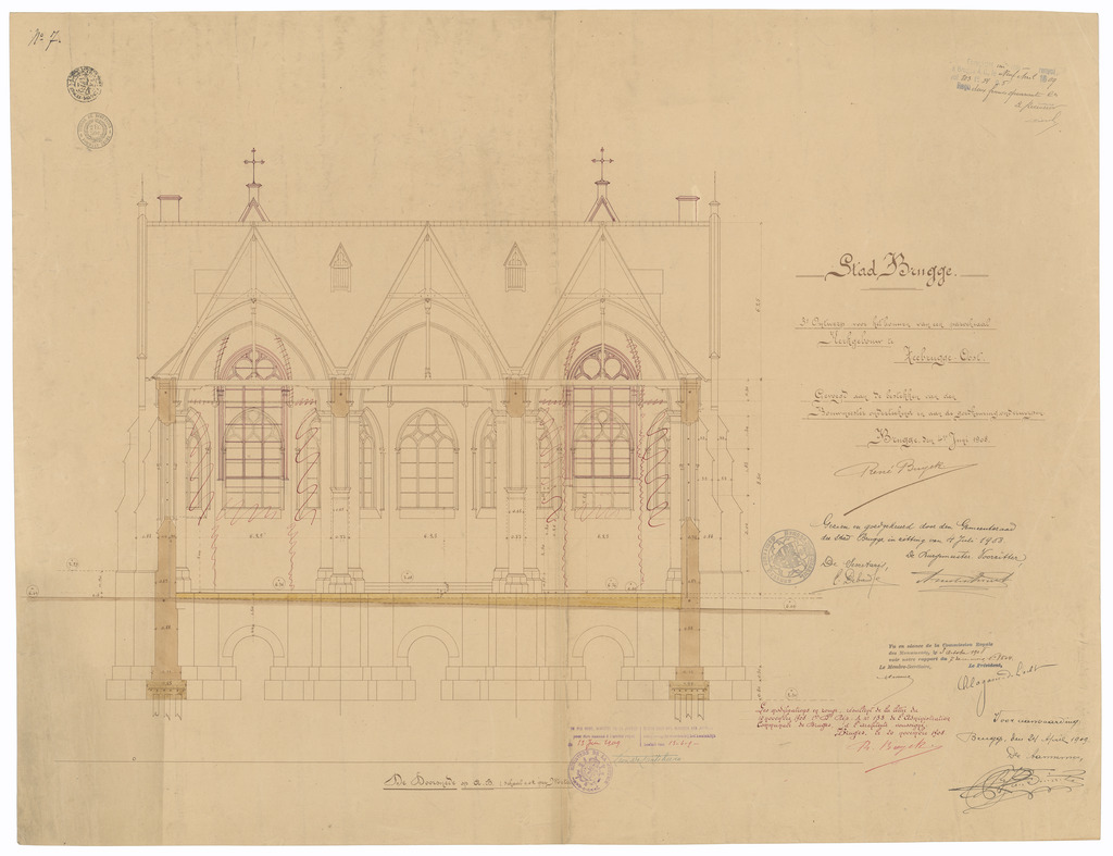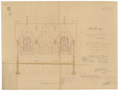 Opschrift: Stad Brugge. 3e ontwerp voor het opbouwen van een parochiaal kerkgebouw te Zeebrugge-Oost. Omschrijving plan: dwarsdoorsnede Datum KCML: 3-10-1908 Archiefnummer: W0318