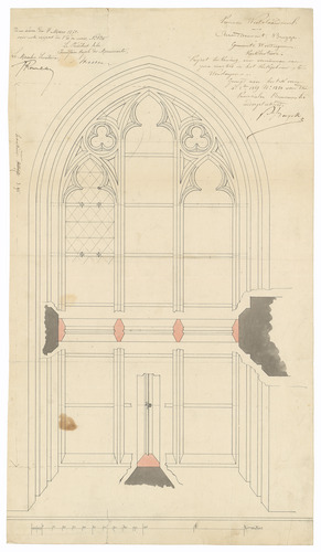 Opschrift: Provincie Westvlaanderen. Arrondissement Brugge. Gemeente Wenduyne. Kerkbestuur. Project teekening voor vernieuwen van zeven vensters in het Kerkgebouw te Wenduyne Omschrijving plan: detailtekening venster Datum KCML: 04/03/1871 Archiefnummer: W0375