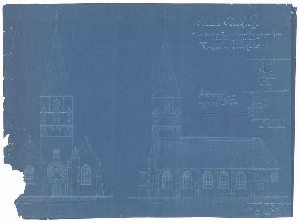 Opschrift: Gemeente Clemskerke. 3e ontwerp voor de herstellingswerken aan het kerkgebouw. Omschrijving plan: opstand voorgevel, opstand zuidelijke zijgevel Datum KCML: deze informatie wordt niet vermeld op het archiefstuk Archiefnummer: W0372