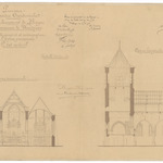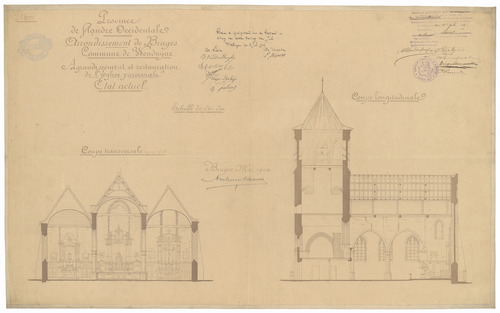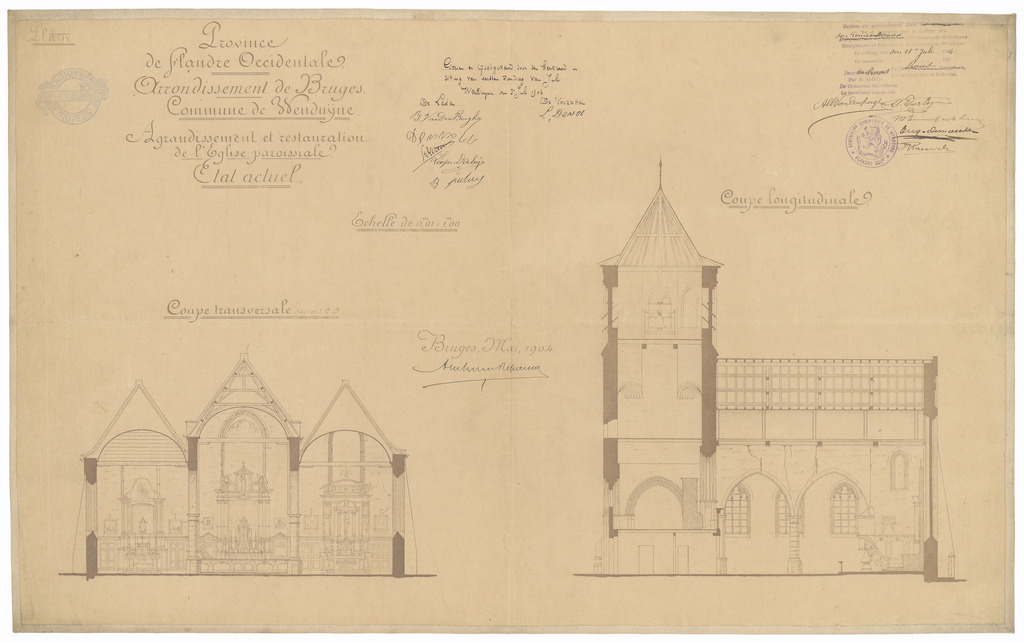 Opschrift: Province de Flandre Occidentale. Arrondissement de Bruges. Commune de Wenduÿne. Agrandissement et restauration de l'Eglise paroissiale. Omschrijving plan: dwars- en langsdoorsnede Datum KCML: deze informatie wordt niet vermeld op het archiefstuk Archiefnummer: W0381