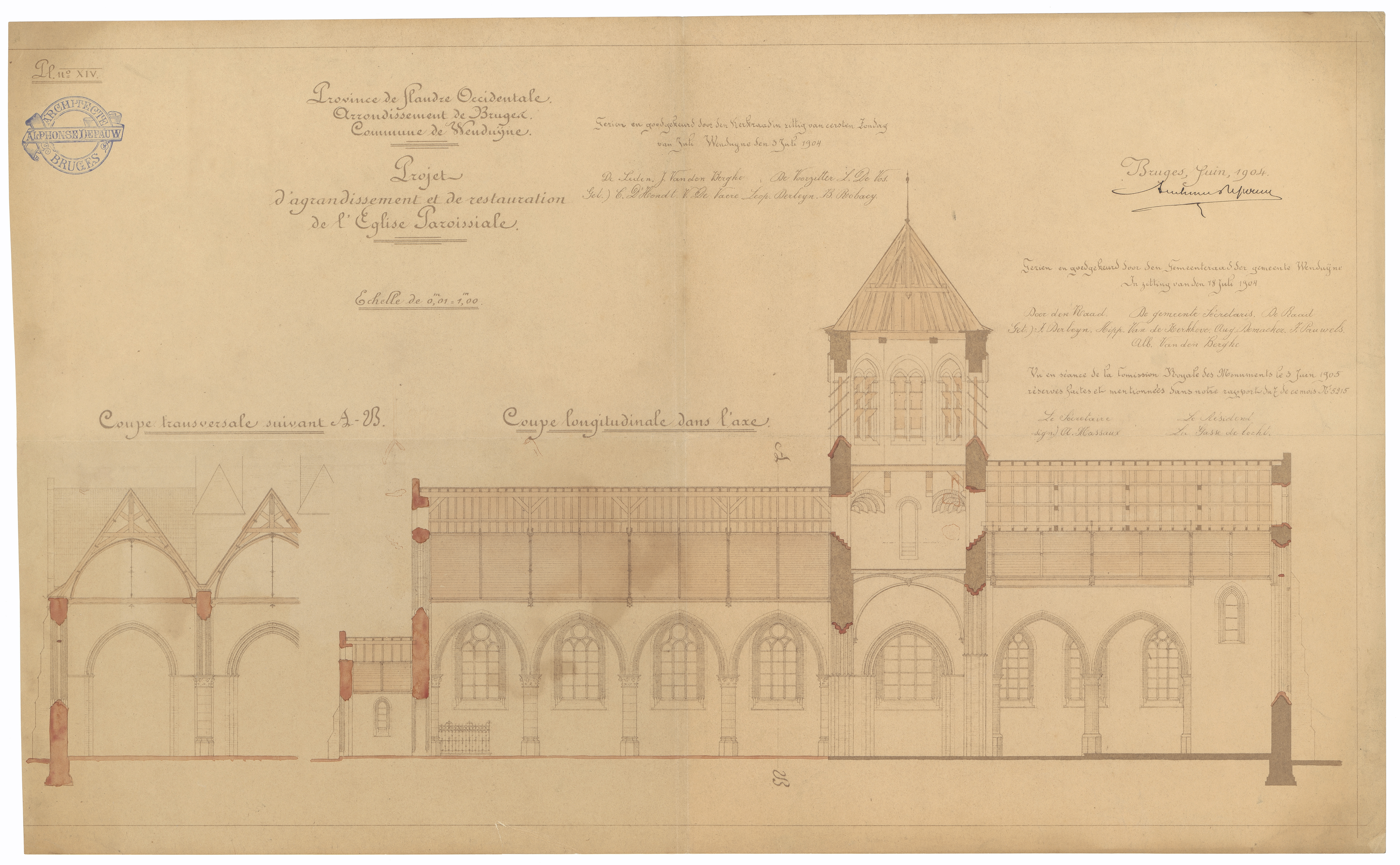 Opschrift: Province de Flandre Occidentale. Arrondissement de Bruges. Commune de Wenduÿne. Projet d'agrandissement et restauration de l'Eglise paroissiale. Omschrijving plan: langs- en dwarsdoorsnede Datum KCML: 3-6-1905 Archiefnummer: W0385