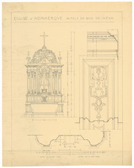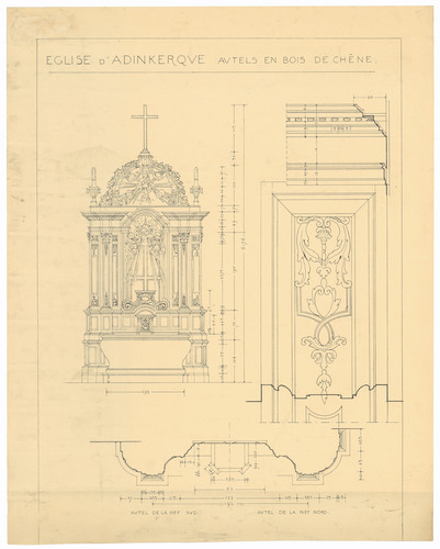 Opschrift: Eglise d'Adinkerque. Autels en bois de chêne. Omschrijving plan: ontwerp altaar Datum KCML: deze informatie wordt niet vermeld op het archiefstuk Archiefnummer: W0404