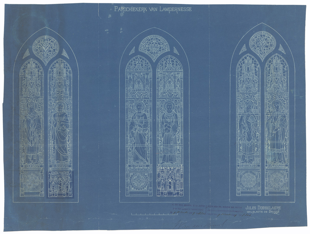 Opschrift: Parochiekerk van Lampernisse Omschrijving plan: ontwerp glasramen Datum KCML: deze informatie wordt niet vermeld op het archiefstuk Archiefnummer: W0459