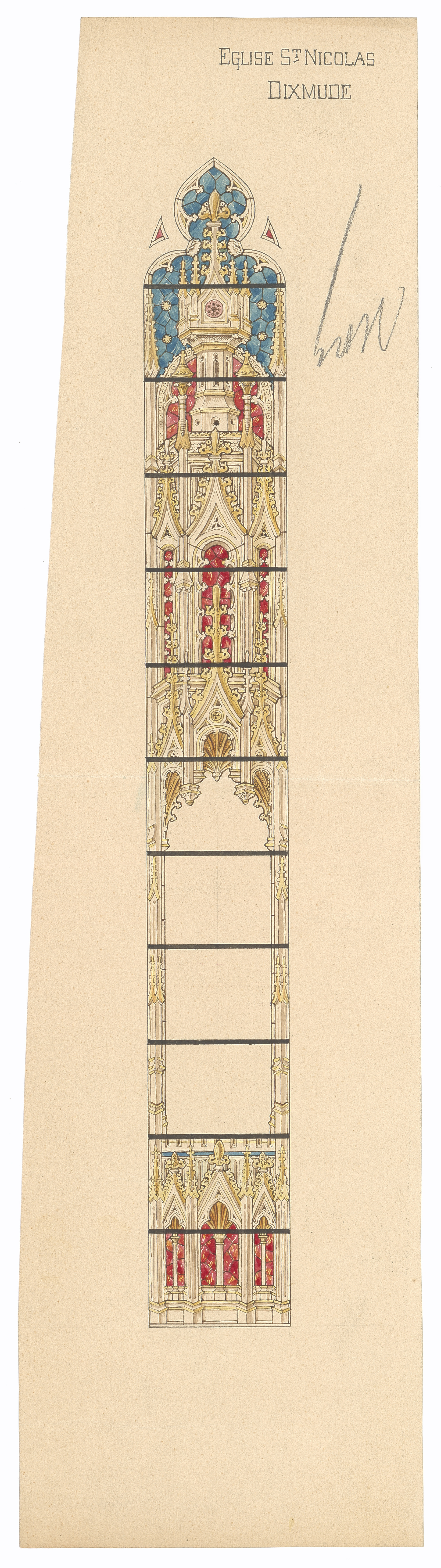 Opschrift: Eglise St. Nicolas Dixmude Omschrijving plan: detailtekening glasraam Datum KCML: deze informatie wordt niet vermeld op het archiefstuk Archiefnummer: W0416