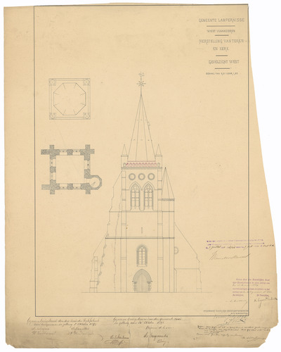 Opschrift: Gemeente Lampernisse. West Vlaanderen. Herstelling van toren en kerk Omschrijving plan: opstand voorgevel Datum KCML: 18/03/1899 Archiefnummer: W0454