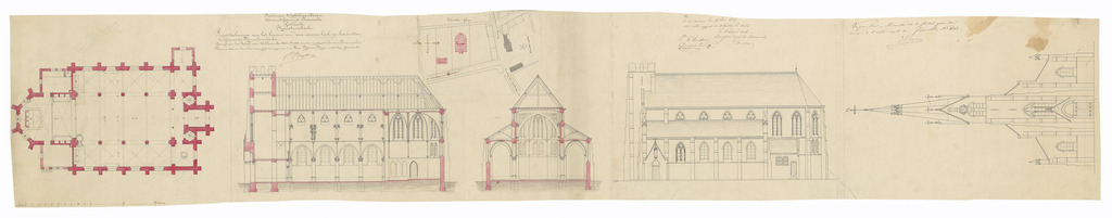 Opschrift: Provincie Westvlaenderen. Arrondissement Dixmude. Gemeente Stuyvekenskerke. Project teekening voor het bouwen van eene nieuwe kerk in het midden der gemeente Stuyvekenskerke Omschrijving plan: plattegrond, langsdoorsnede, situatieschets, dwarsdoorsnede, opstand zijgevel en opstand voorgevel Datum KCML: 29/06/1867 Archiefnummer: W0490